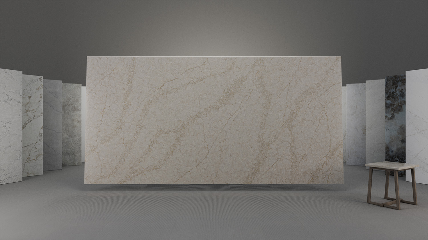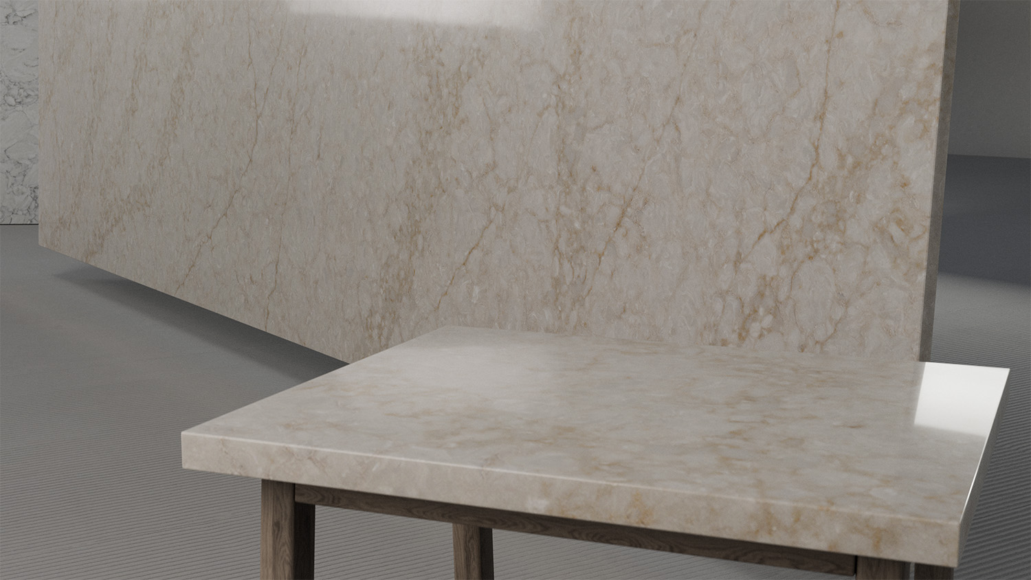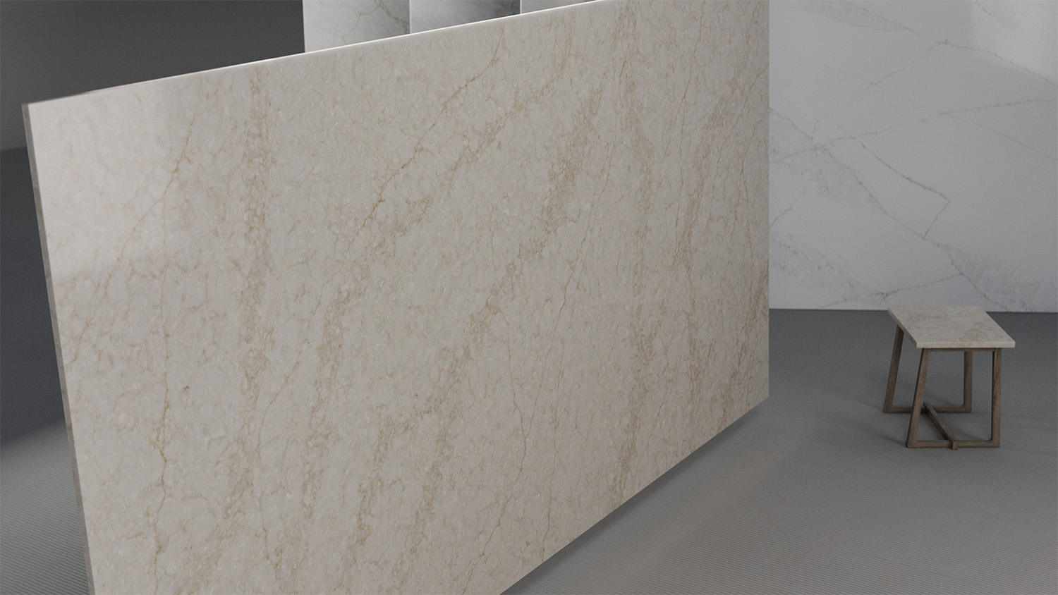 The visual qualities of a natural stone, marbled with fresco qualities in its appearance.